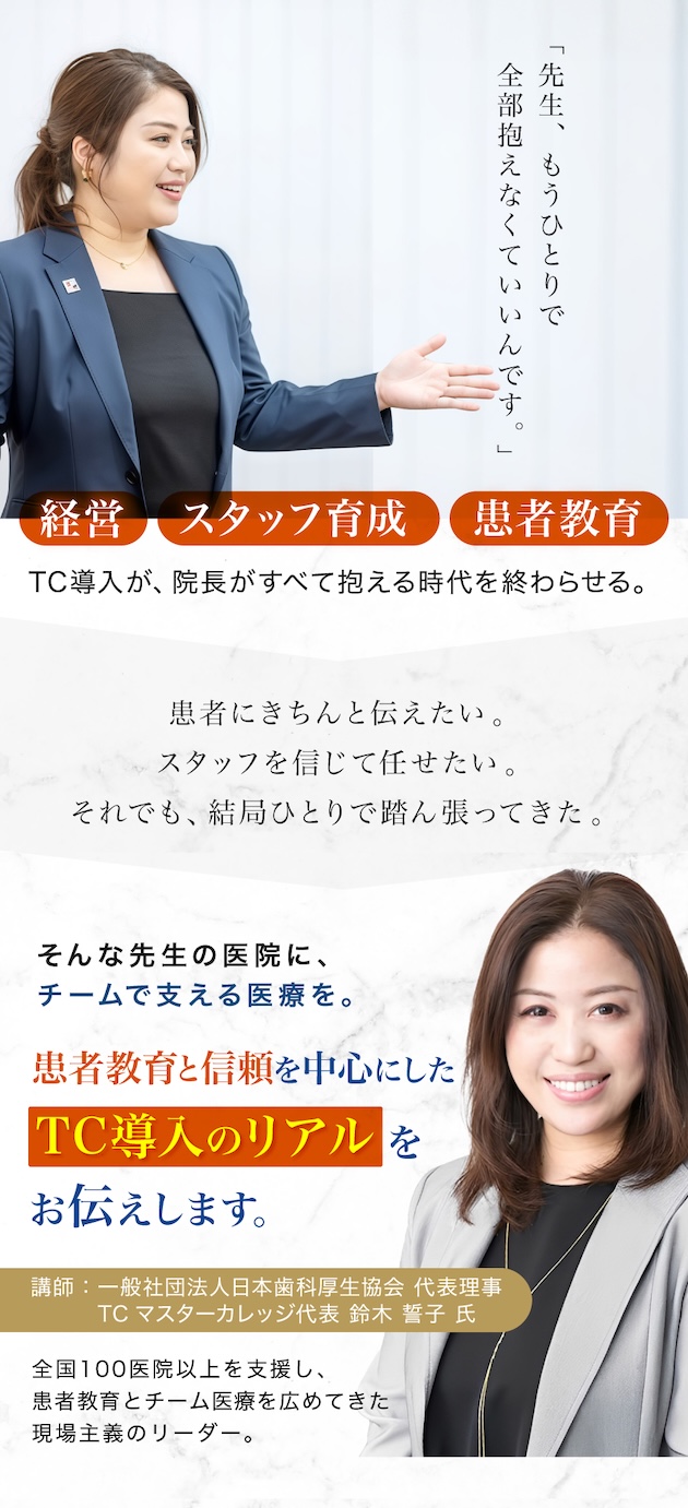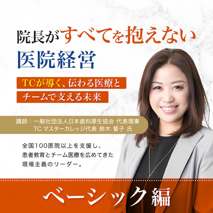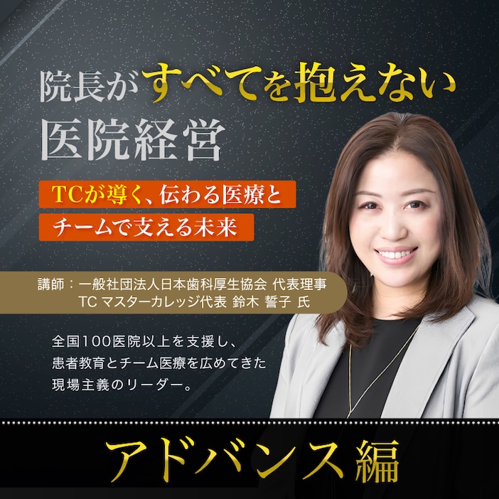 このアドバンス編は、ベーシック編をご受講いただいた先生限定のご案内です。スタッフが自走する仕組みづくり、患者が納得する説明法、TCを医院の“軸”にする運用まで──、鈴木先生が全国の導入医院を支援してきた実践ノウハウを体系的に学べます。