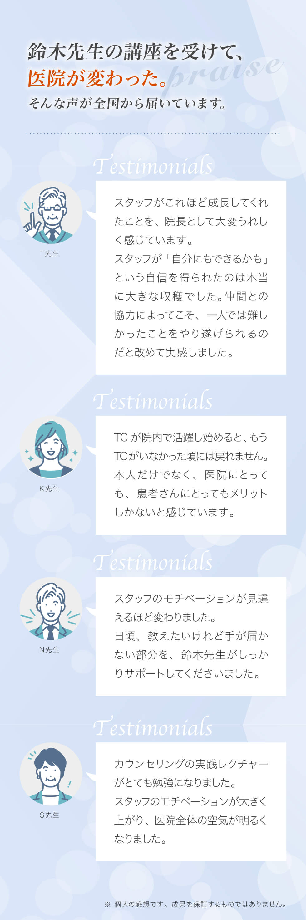 私はTCを、医院の売上を上げるだけの存在とは思っていません。TCは、患者さんに正しい情報を届け、 歯科医療の価値を理解に変えるための専門職です。