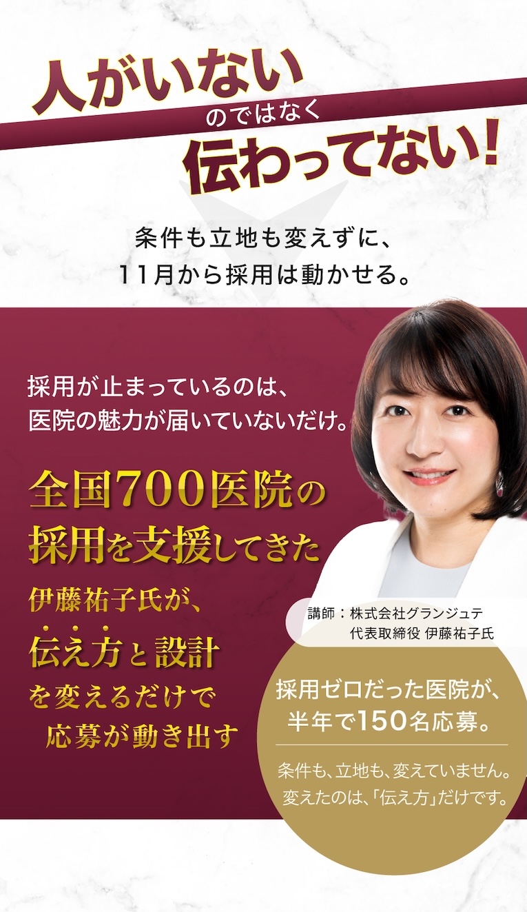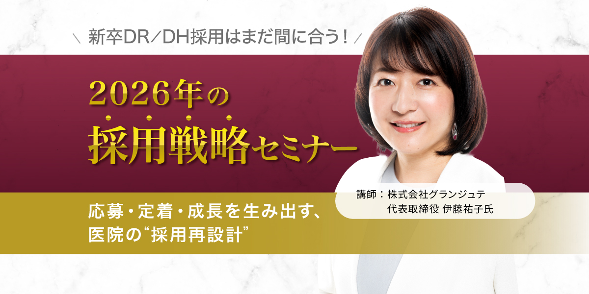 私はこれまで、数多くの先生方とご一緒してきましたが、「求人を出しても反応がない」「スタッフが定着しない」という悩みは、どの医院にも共通しています。だからこそ、今回の伊藤祐子氏による講義を、どうしても多くの先生に届けたいと思っています。