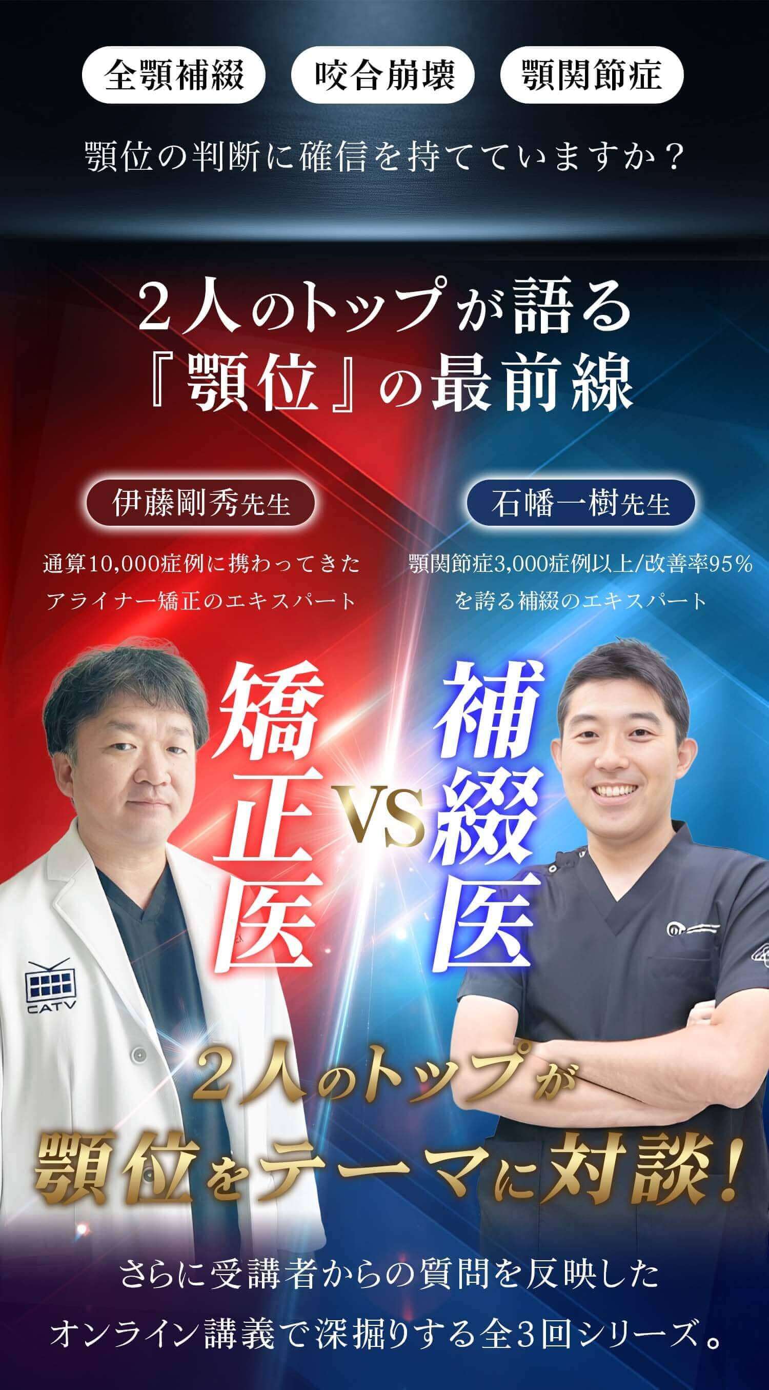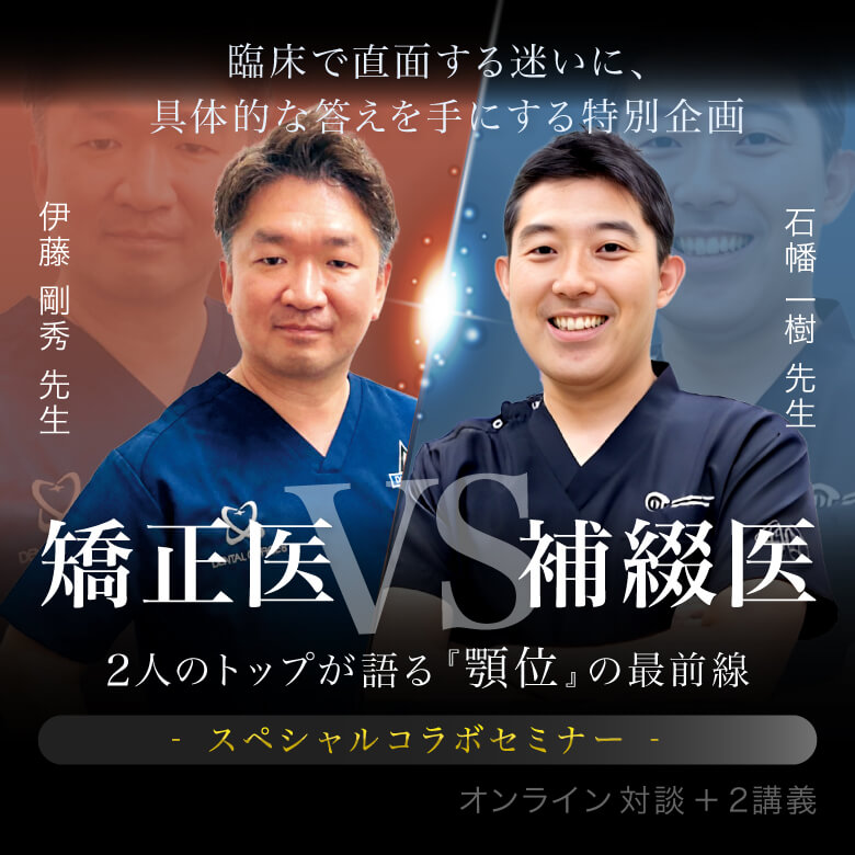 ここまでご覧いただきありがとうございます。今回の企画は、「顎位」を補綴と矯正の両側面から深めるためのオンライン講座です。講師は、補綴から顎位を見抜く石幡一樹先生(顎関節症3,000症例・95%改善)と、矯正側のトップランナー伊藤剛秀先生(レッドダイヤモンド 日本人初・3年連続/ピーク時2,600症例)。この二人が同じテーブルで顎位を語る機会は、史上初めてのことです。