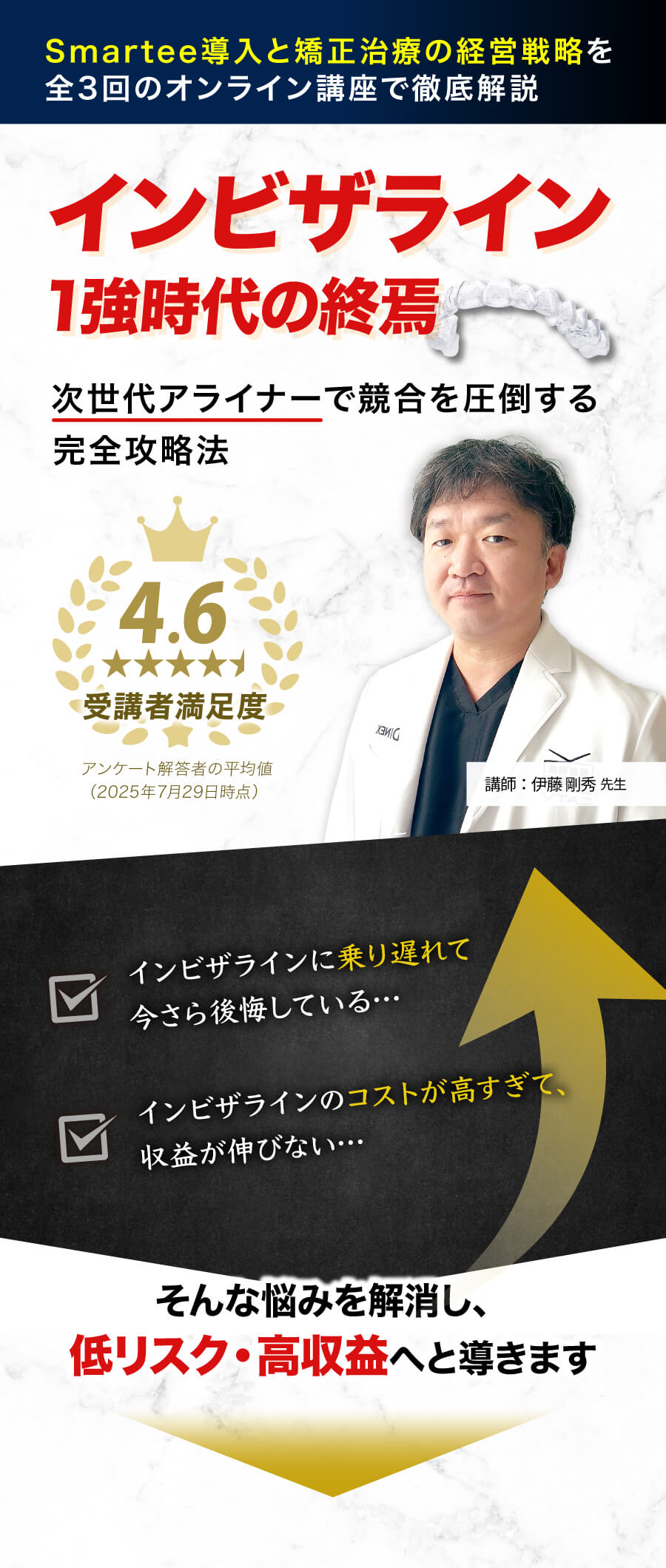このセミナーの企画が立ち上がったのは、多くの先生方がインビザライン導入で期待したほど利益を得られずにいる現状を伊藤先生からお伺いしたことがきっかけでした。